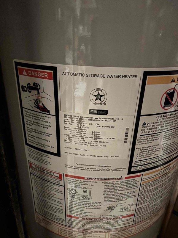 Successfully installed new automatic storage water heater in utility area. Verified proper installation of unit with appropriate gas connections and confirmed all warning labels and manufacturer information were intact and visible. Unit was tested and is operating according to specifications with no leaks or anomalies detected.