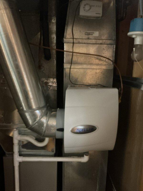 Successfully installed an Aprilaire manual humidifier on the existing HVAC system, properly connecting it to the ductwork with a metal elbow pipe. Completed all necessary electrical and water supply connections, ensuring proper drainage via PVC piping for optimal humidity control throughout the home.