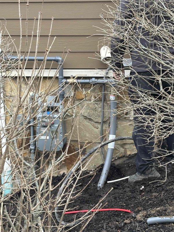 Completed full HVAC system installation including new residential furnace and outdoor air conditioning condenser unit. Furnace installed in basement utility area on protective base pad with proper PVC venting and condensate drainage system, metallic supply trunk ductwork connected and secured. Exterior AC condenser positioned on concrete pad with refrigerant lines run to house, electrical disconnect box mounted, and unit tested for proper operation.