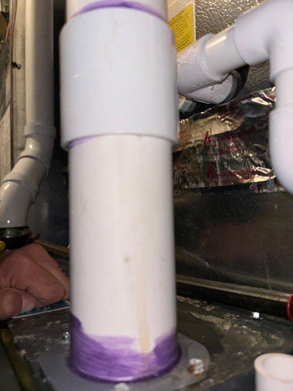 Responded to service call for water leaking from 20-year-old Lennox furnace. Upon inspection, utilized borescope camera to examine internal ductwork and drainage pathways for blockages or damage. Identified water staining and corrosion at pipe penetration point on wall, indicating active leak from condensate drain system. Documented conditions with photos showing rust streaking down wall surface and connection hardware requiring attention. Condensate drainage components inspected including drain lines and pump assembly with attached hoses.