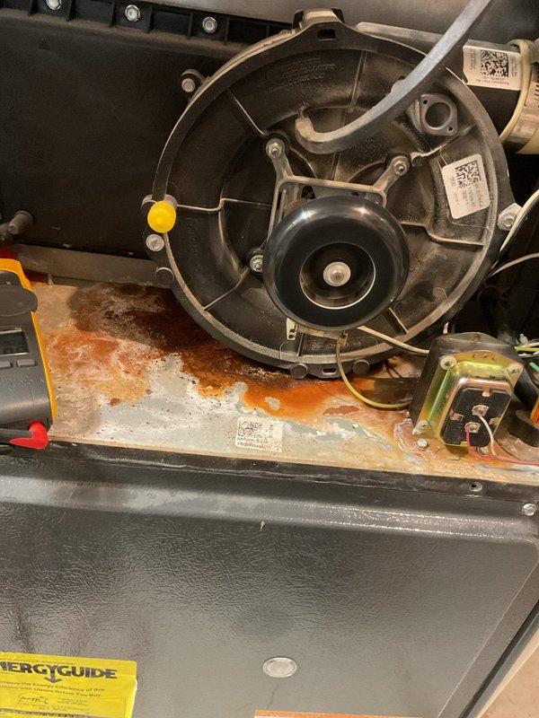 Responded to emergency service call for a 15-year-old HVAC system with intermittent operation issues. Upon inspection, found significant rust and corrosion on the furnace base plate beneath the blower assembly, indicating possible moisture exposure. Diagnosed faulty pressure switch causing system to cycle improperly (shutting down after 20 minutes, then restarting after 15 minutes); replaced pressure switch and verified proper system operation.