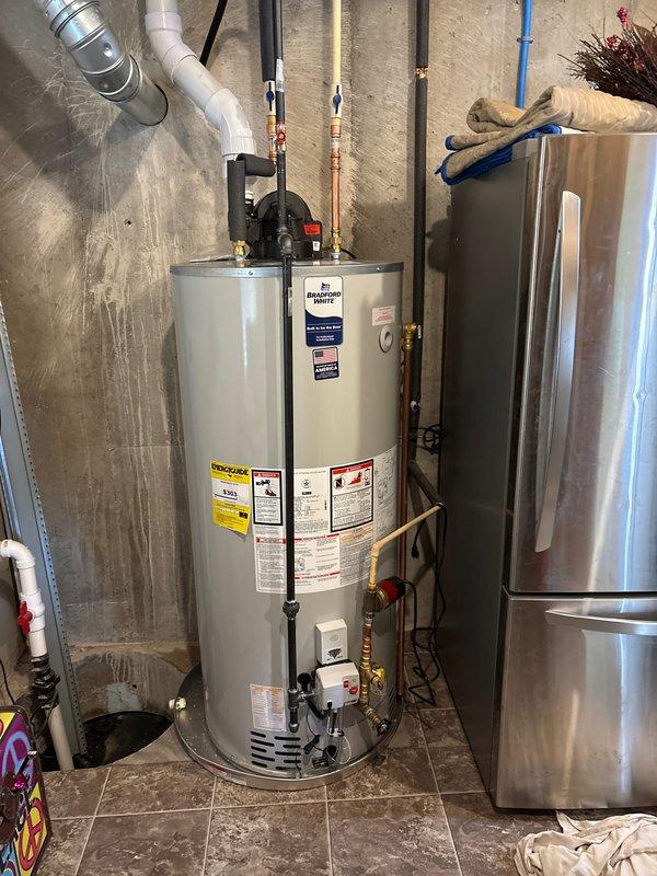 Successfully installed a 40-gallon natural gas water heater (6-year warranty, short model) with expansion tank in residential mechanical room. Completed all necessary copper pipe connections and ensured proper integration with existing plumbing system. Final inspection confirmed proper operation with no leaks or safety issues.