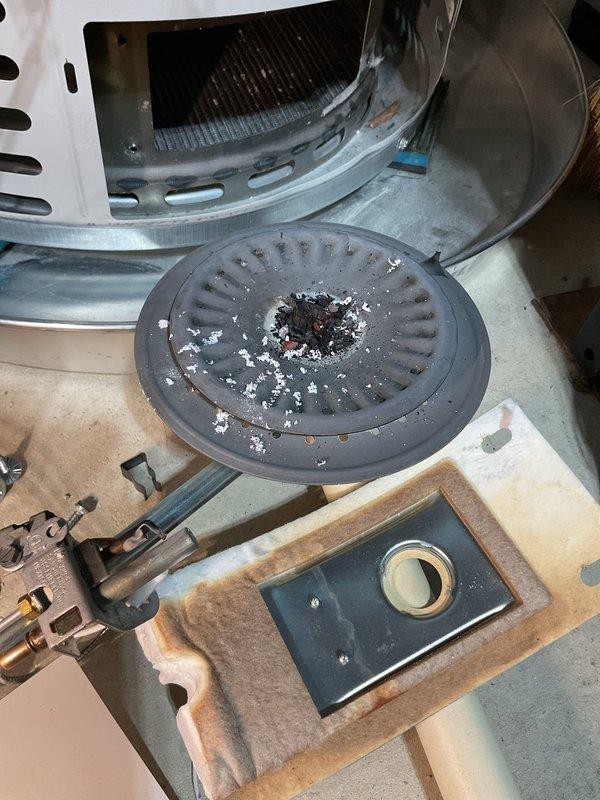 Completed annual heating service on a furnace and humidifier system that is approximately 18 years old. Inspection revealed significant mold/mildew growth and discoloration on humidifier components. Cleaned affected surfaces and documented condition with photos for future reference.