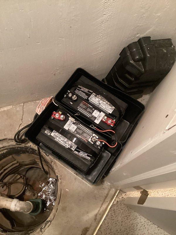 Performed site assessment and provided quotation for replacement of existing sump pump system with new unit and battery backup installation. Documented current setup consisting of dual batteries with terminal connections in plastic housing positioned adjacent to sump pit with PVC discharge piping. Evaluation included assessment of concrete floor conditions showing moisture indicators near drain area.