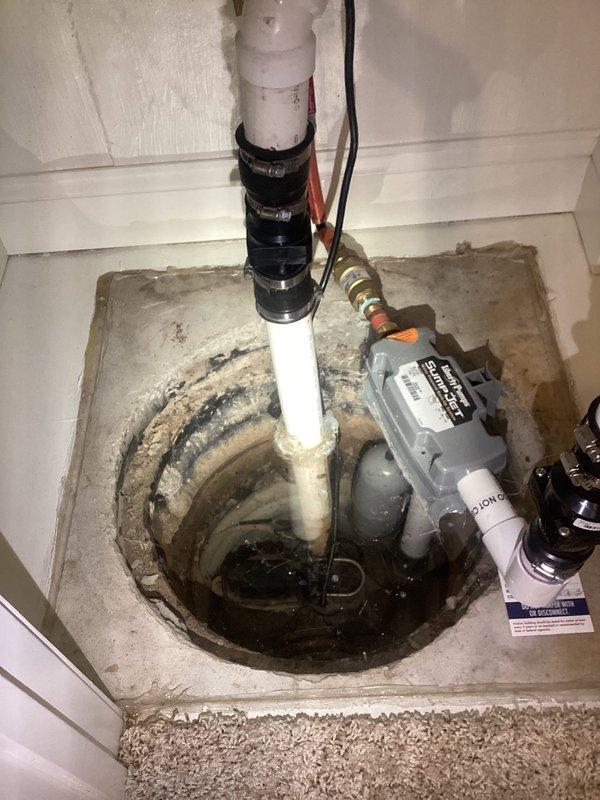 Inspected non-operational sump pump system that had been inactive for approximately six years. System includes integrated radon detector. Upon examination, found standing water in sump pit and verified electrical connections. Serviced pump mechanism, cleared discharge line, and tested system functionality to restore proper water ejection operation.