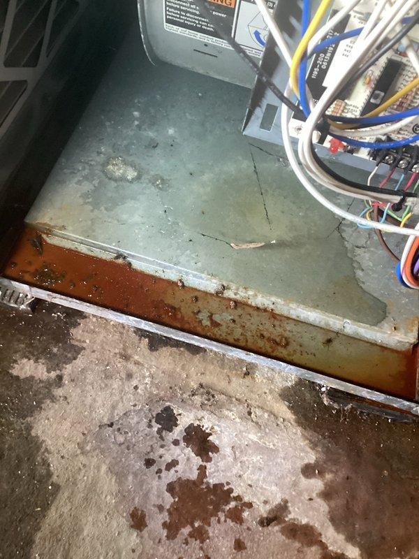 # Service Report: No Heat Call Responded to no heat service call for 10-year-old furnace unit that was not turning on. Upon arrival, performed system inspection and discovered extensive rust and corrosion throughout the equipment base and cabinet interior, indicating prolonged moisture exposure and deterioration of critical components. The corrosion was particularly severe along base panel edges, seams, and floor contact points, with rust damage extending to adjacent surfaces and electrical housing areas. Documented equipment condition with photographs showing compromised cabinet integrity, corroded metal surfaces, water staining on concrete pad beneath unit, and potential concerns with electrical component exposure to moisture. The level of deterioration observed suggests the unit has experienced repeated water intrusion over an extended period, resulting in structural and operational compromise. Advised customer that the extensive corrosion present creates safety concerns and sign