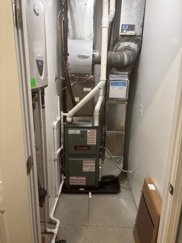 Completed full furnace installation in residential mechanical closet. Installed new Amana furnace unit with proper PVC venting routed through existing ductwork system, connected all refrigerant lines, and integrated air filtration system with digital control panel. System tested and operational, with all components properly secured and labeled per manufacturer specifications.