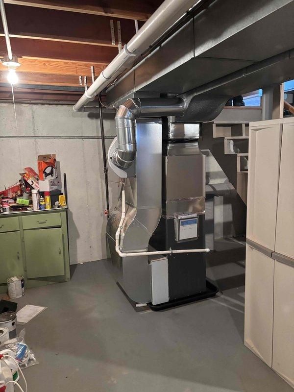 Successfully completed installation of new furnace unit in basement utility area. System includes proper ducting with metal piping connections and appropriate elbow joints secured to ceiling joists. Unit is fully operational with all connections properly sealed and tested.