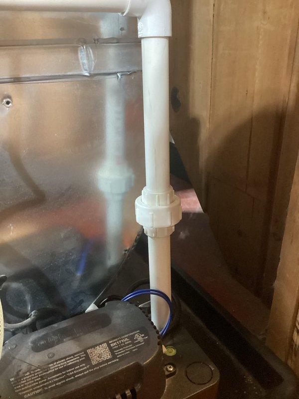 Performed estimate for backup sump pump installation in basement. Inspected existing sump pit containing standing water with visible float switch mechanism and documented current discharge plumbing configuration. Evaluated wall-mounted PVC discharge pipe system with installed check valve and noted signs of previous moisture issues requiring attention during potential installation.