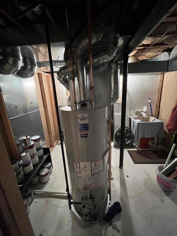 Successfully installed a 50-gallon natural draft, natural gas water heater in utility room. System was properly connected to existing gas line and vent stack with all necessary fittings. New unit comes with 6-year parts and 1-year labor warranty.