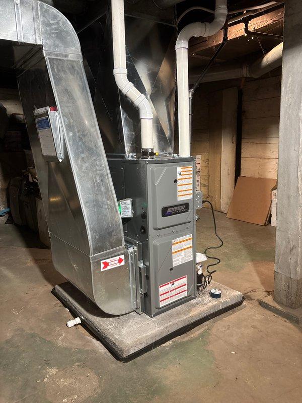 Successfully installed new furnace unit in basement utility room, connecting to existing ductwork and PVC venting system. Performed complete installation including electrical connections and verified proper operation of the new system before completion.