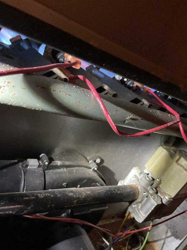 Diagnosed recurring no heat issue on 17-year-old Energi furnace. Discovered damaged blue cylindrical component with visible interior damage at connection point. Observed wear and possible corrosion on metal fixtures within the aging system, likely contributing to the repeated service calls for the same problem.