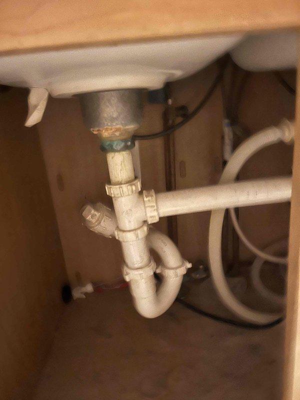Diagnosed and repaired bathroom sink leak by replacing corroded p-trap assembly showing significant mineral buildup at connection points. Verified proper drainage and ensured no leakage at all connection points after installation of new PVC drain components.