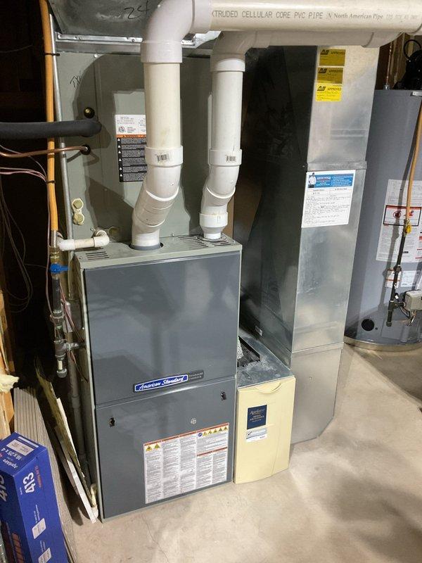 Performed no-heat diagnostic on American Standard furnace system with technician arrival between 12-2. Inspection revealed existing system in basement with intake/exhaust PVC venting. Customer indicated urgency for replacement solution.