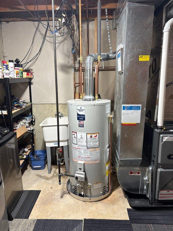 Successfully installed new water heater unit in basement utility area, including proper connection of copper supply lines and metal vent pipe. Ensured all safety connections were secure and system was operating correctly before completing installation.