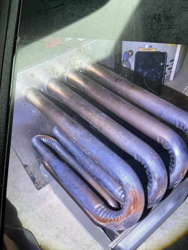 Completed heat exchanger replacement as per quoted repair. Removed old copper coils showing oxidation and surface tarnishing, and installed new heat exchanger assembly. System functioning properly after 4-hour installation with all connections verified and tested.