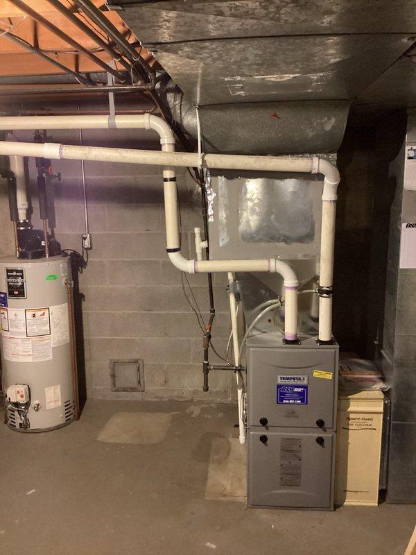 Successfully completed furnace installation in basement utility area. Installed new residential HVAC unit with proper PVC venting, condensate drainage system, and connection to existing ductwork. System was tested and verified to be functioning correctly.