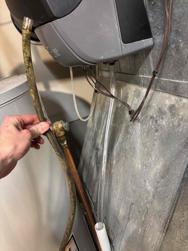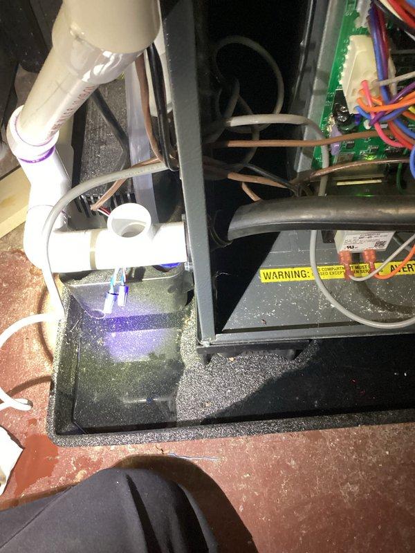 Responded to water leak issue involving water heater in basement. Identified leak originating from condensate pump system with pooling water beneath the pan. Installed new fitting/connector to resolve leak and inspected surrounding plumbing connections to ensure proper operation.