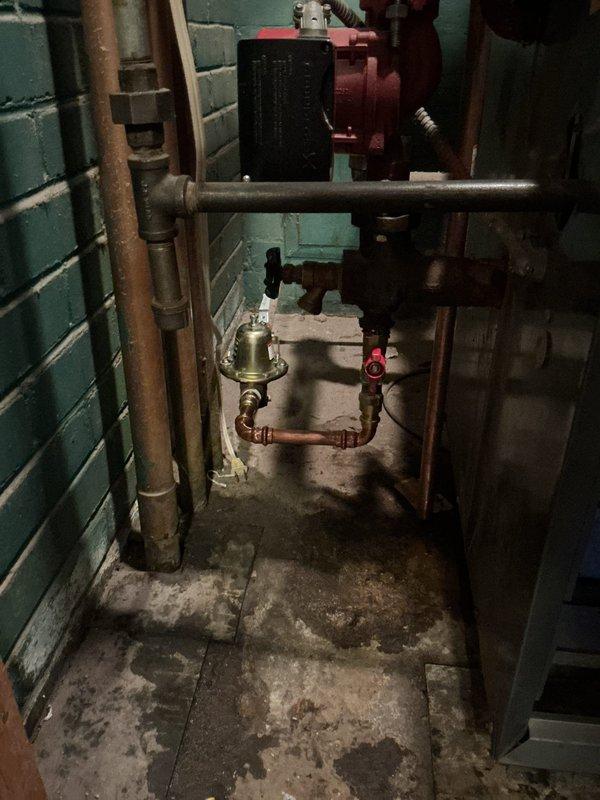 Performed annual heating tune-up on a 2016 CM system. Inspected basement mechanical room with circulation pump, pressure regulator, and copper piping. Noted significant water staining on concrete floor indicating possible previous leaks; system currently operational with no humidifier present.