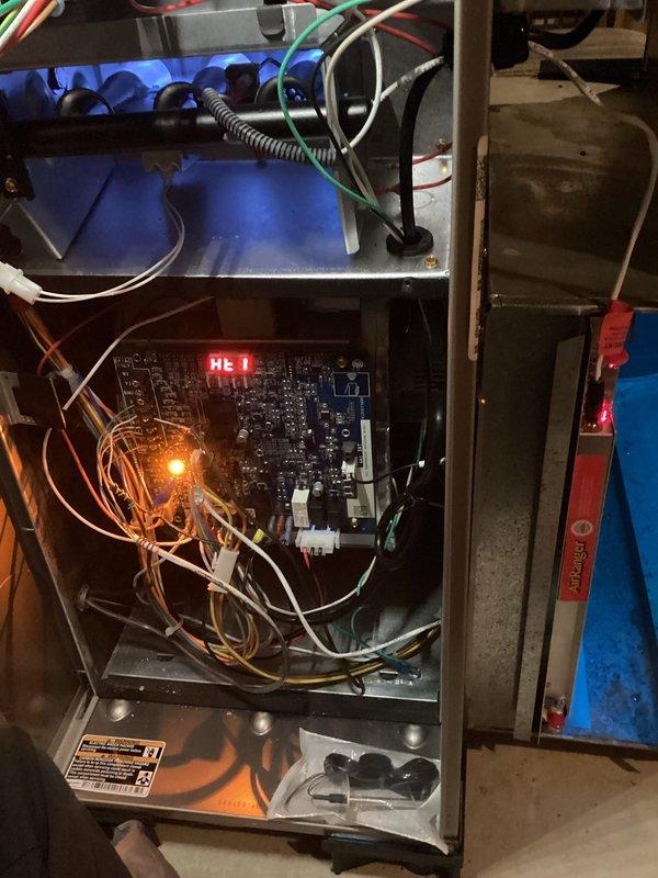 Performed annual maintenance on 1-year-old Carrier furnace (model WT 12-2034). Inspected circuit board which displayed "HL7" code on digital readout with amber indicator light illuminated. System has functioning humidifier. Documented condition with photos and completed preventative maintenance per manufacturer specifications.