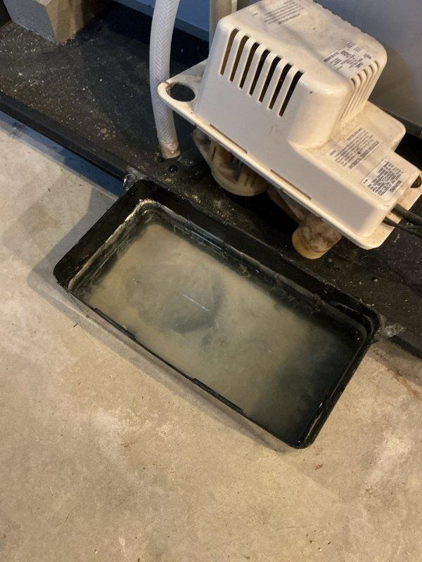 Completed annual heating maintenance visit on Bosch system. Inspected condensate drain pan and pump system, noting standing water in collection pan. Cleaned pan to ensure proper drainage and verified pump operation to prevent future water accumulation.