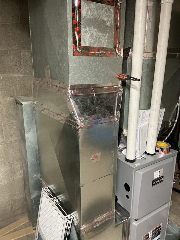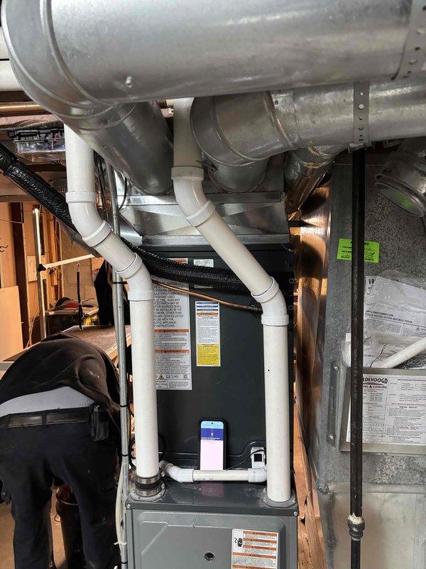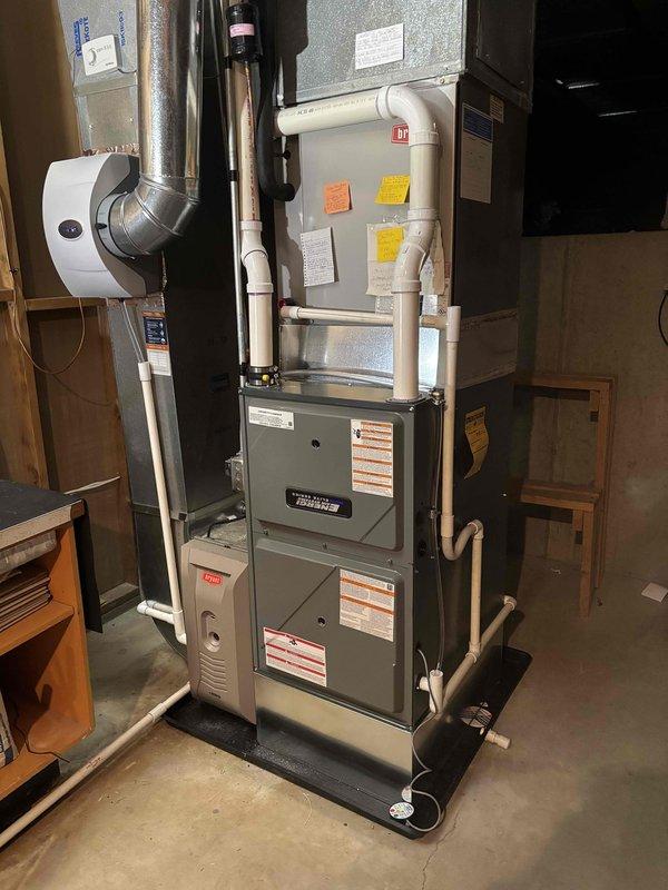 Successfully completed full replacement of AC system in basement utility area. Installation included new furnace/air handler unit with proper connection to existing ductwork system and installation of PVC condensate drain lines. System was fully tested and is operating correctly with all manufacturer specifications met.