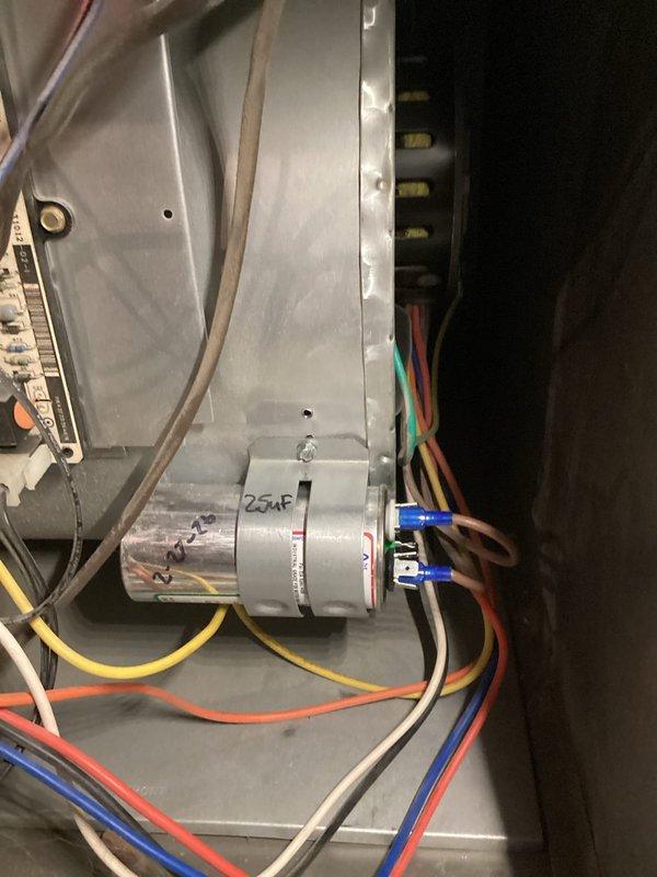 Performed annual heating tune-up on 13-year-old Bryant furnace (CM: 2020). Inspected system components including the 25uF capacitor and associated wiring connections. No humidifier present. System functioning properly after service.