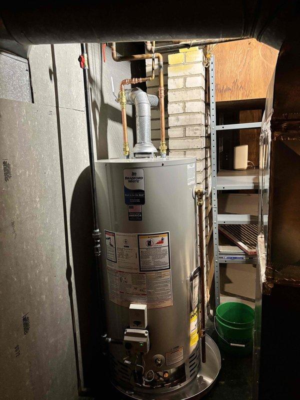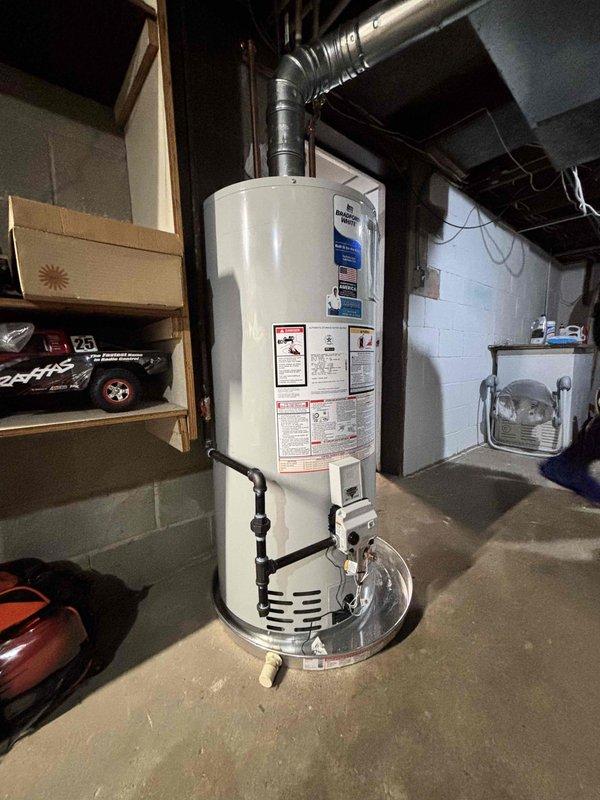 Successfully installed a 40-gallon natural gas water heater with 6-inch vent configuration in the customer's basement utility area. The unit was properly positioned on a metal drip pan with all gas connections, plumbing fixtures, and venting installed to code specifications, ensuring safe and efficient operation.