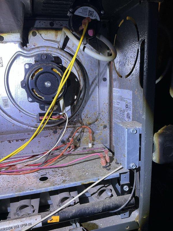 Completed annual heating maintenance on 15-year-old Goodman furnace system. Performed comprehensive tune-up including inspection of blower motor assembly, electrical connections, and internal components. Verified proper operation of all system controls, checked wire harnesses and connections for integrity, and assessed overall unit condition. Documented equipment condition with photos showing accessible internal components and mechanical systems operating within normal parameters.