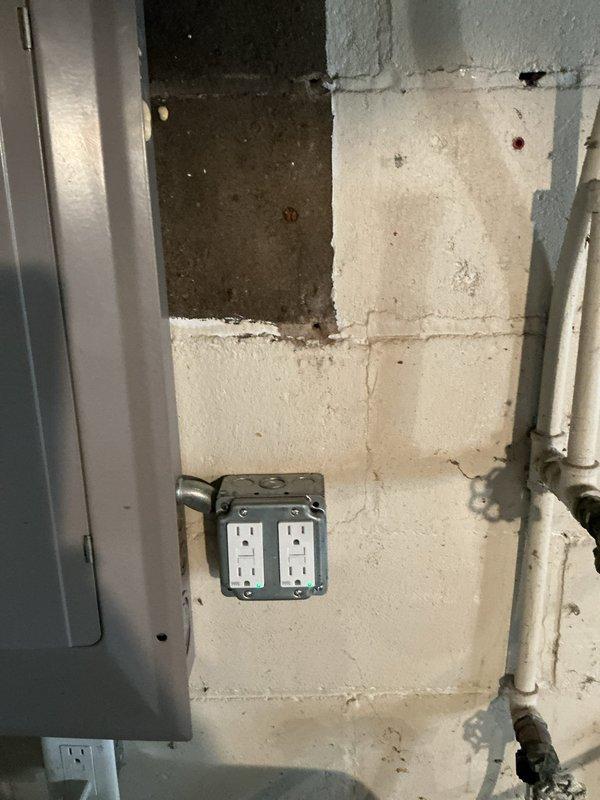 Replaced defective electrical outlets in basement utility area. Installed new weatherproof duplex receptacles in gray electrical box mounted on painted concrete block wall, ensuring proper grounding and secure connections per code requirements.