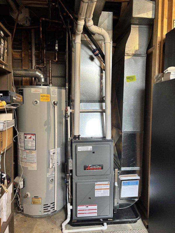 Successfully installed new Amana furnace unit in customer's basement utility area, including proper connection to existing PVC ventilation system and ductwork. System was tested and confirmed to be in proper working condition with all safety components functioning as designed.