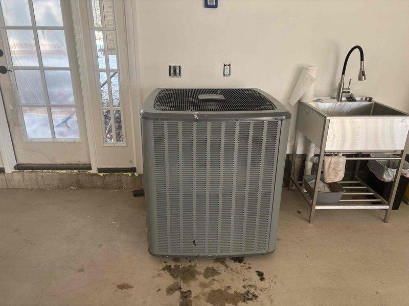 Relocated air conditioning unit within utility room per customer request. Unit appears to be a standard gray heat pump with horizontal ventilation slats. Performed level 2 service to safely disconnect, move, and reinstall the system. No operational issues observed after reinstallation.