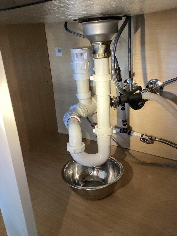 Diagnosed kitchen sink dual-basin drainage issue where water backed up into adjacent sink during drain use. Inspection revealed aged P-trap assembly with corrosion at sink connection and deteriorated wall area around drain exit point. Also identified leaking water supply valves at washer connection in basement requiring replacement.