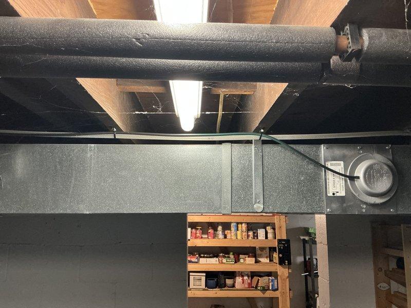 Completed basement HVAC estimate for adding air runs, vents, and zoning control to unfinished basement, plus water heater relocation. Current system is a 16-year-old Goodman furnace with coil manufactured in 2022. Photos documented existing ductwork configuration and mechanical space with exposed ceiling joists, requiring modification for proper airflow distribution.