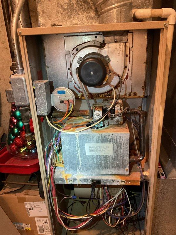 Responded to service call for a heating system not reaching set temperature (thermostat reading 63°). Upon inspection of the 30-year-old furnace, discovered significant dust accumulation and aging components affecting performance. Cleaned system, adjusted connections, and restored proper heating function to match thermostat settings.