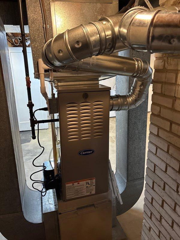 Completed installation of new Carrier furnace system in basement. Installed all required metal ductwork connections and verified proper electrical connections to unit. System was tested and confirmed to be operating correctly with all components securely mounted.