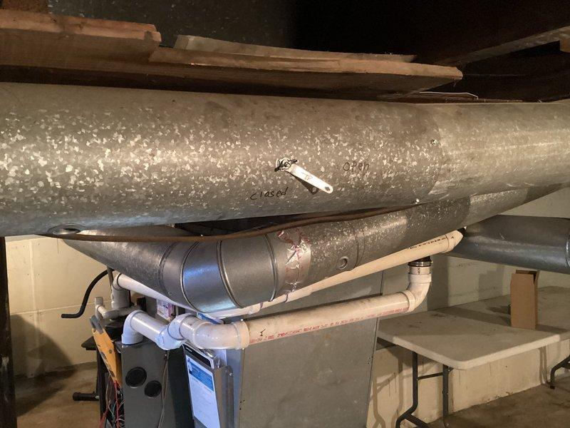 Responded to complaint of furnace making unusual noise. Inspected HVAC system and ductwork in mechanical space, identifying source of noise in metal duct system. Documented existing installation conditions including ductwork configuration, support structure, and label information for unit approximately 8 years old.