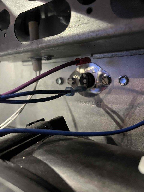 Responded to no heat call following recent furnace tune-up where unit was running but not producing heat. Upon inspection, discovered loose or disconnected wire at the heating element terminal block. Reconnected and secured all electrical connections at terminal block, including red, blue, and black wires with proper terminations. Tested system operation and confirmed unit now heating properly with all components functioning as designed.