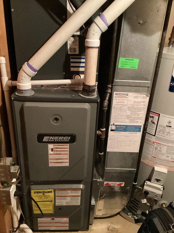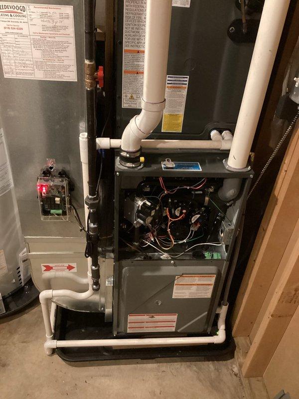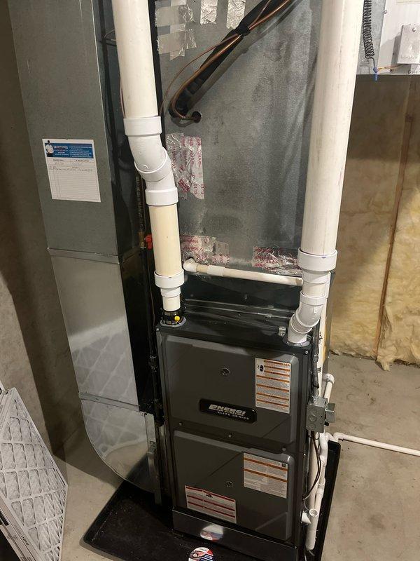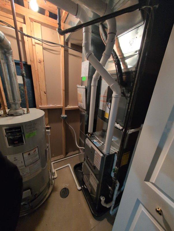 Successfully completed installation of new furnace unit in residential utility room. System was properly connected to existing ductwork and vented with PVC piping. All connections were tested and unit is functioning according to manufacturer specifications.