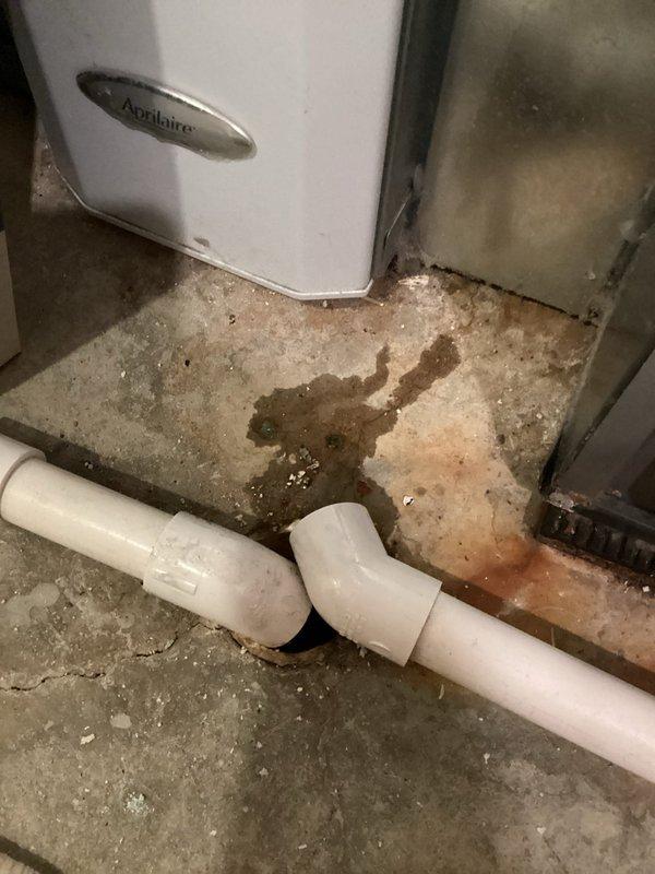 Performed annual heating service and maintenance on furnace system with integrated Aprilaire humidifier. Documented significant water damage on concrete floor surrounding unit with moisture staining visible near PVC condensate drainage pipes. System appears functional but moisture issues were documented with photo evidence for future reference.