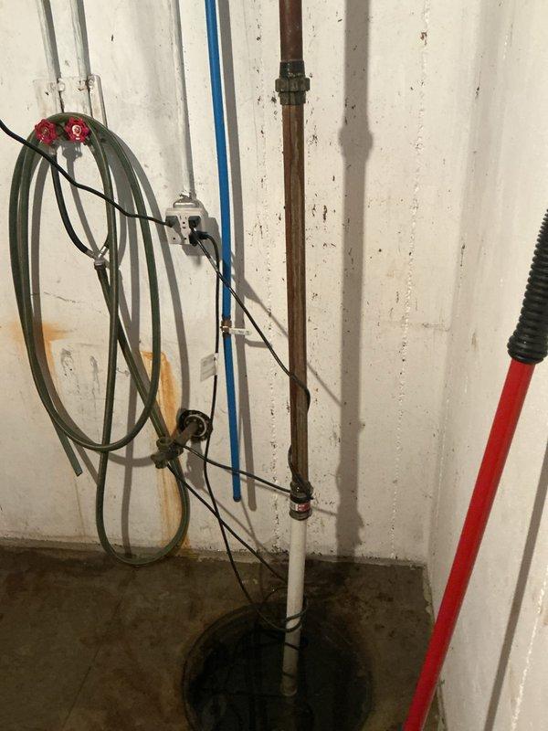 # Service Report: Sump Pump Failure Responded to a failed sump pump system in basement utility area. Upon arrival, found the sump pit filled with standing water and the pump inoperative. Removed the failed sump pump unit from the pit and assessed the existing Charlotte PVC discharge piping and check valve assembly. Installed a new replacement sump pump, reconnected to the existing vertical discharge line, and verified proper check valve operation to prevent backflow. Tested the new pump for proper cycling, float switch activation, and adequate discharge flow through the wall-mounted piping system. Confirmed all electrical connections were secure and the unit was functioning properly before completing the service call.