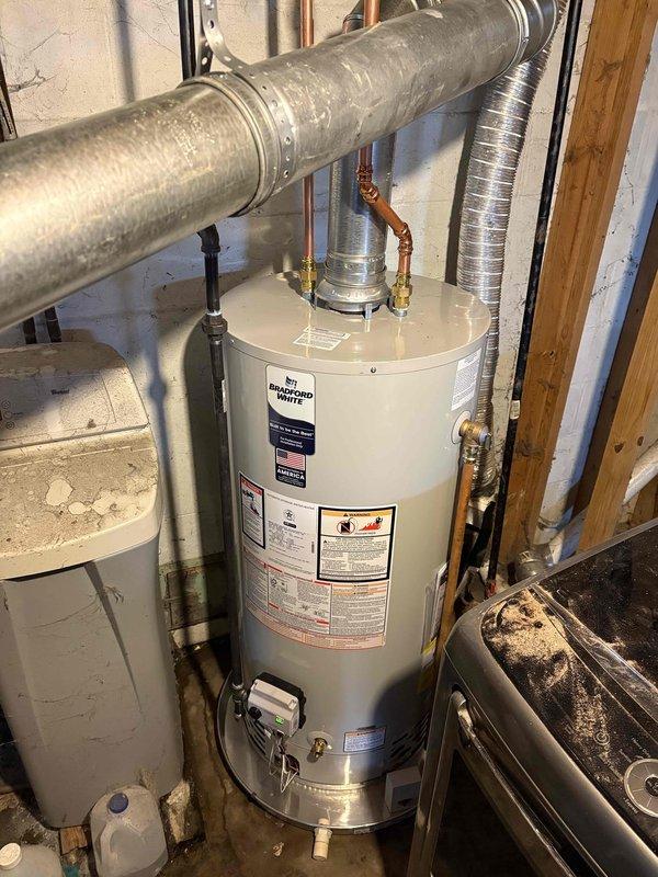 Successfully installed a new Bradford White water heater in the utility area. Completed all necessary plumbing connections, including copper pipe fittings and proper venting through the existing galvanized ductwork. System is operational with all installation requirements met to code.