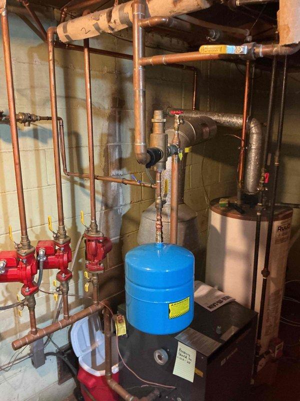 Responded to emergency leak call where water was reported coming from ceiling. Upon inspection, found the source to be a failing connection on the expansion tank in the basement mechanical room. Repaired the leaking joint, tested system pressure, and verified no active leaks before restoring water service to the home. Confirmed no structural damage had occurred from the leak.