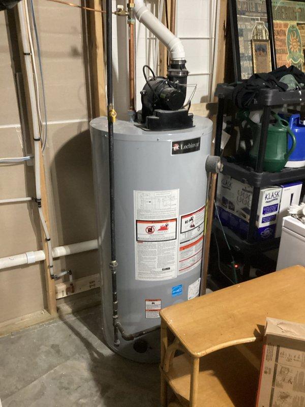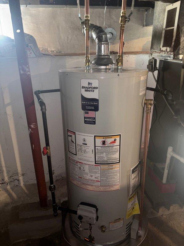 Successfully installed a 40-gallon Bradford White natural gas water heater in utility room. Completed all necessary copper pipe connections, installed proper venting, and ensured all gas fittings were secure and leak-free. Unit is functioning correctly with all safety features verified.