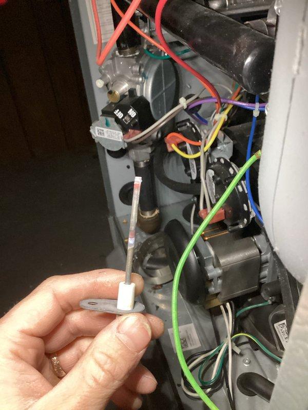 Diagnosed Energi WT furnace that was not producing warm air despite turning on. Performed inspection and testing of internal components, with particular focus on temperature sensors and wiring connections. Replaced faulty flame sensor which was causing improper flame detection, restoring normal heating operation.