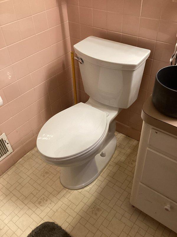 Responded to service call for toilet not flushing properly in residential bathroom with pink tiled walls. Upon inspection of the standard two-piece white porcelain toilet, determined replacement was necessary. Successfully installed new toilet unit, ensuring proper function and connection to existing plumbing.