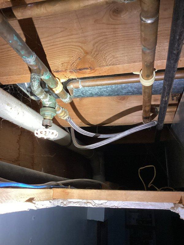 Conducted comprehensive inspection of residential plumbing system in crawl space, documenting existing copper supply lines showing significant corrosion and green patina formation. Prepared detailed estimate for complete repipe service and installation of dedicated water line for refrigerator. Photos captured evidence of water damage to surrounding wooden joists and documentation of current mixed-material plumbing configuration requiring replacement.