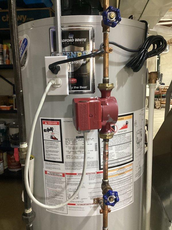 Diagnosed a pinpoint leak on 8-year-old Bradford White water heater that was actively spraying water. Documented condition with photos showing the unit's copper piping, valves, and circulation pump setup. Customer opted for water heater replacement due to age and leak severity.