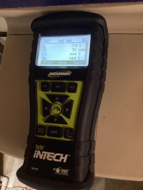 Performed annual heating and humidifier maintenance on 14-year-old Carrier system. Conducted combustion analysis with Bacharach Fyrite INTECH analyzer showing acceptable readings (O2: 2%, CO: 51ppm). Inspected humidifier operation and adjusted settings to ensure consistent function as client reported intermittent operation.