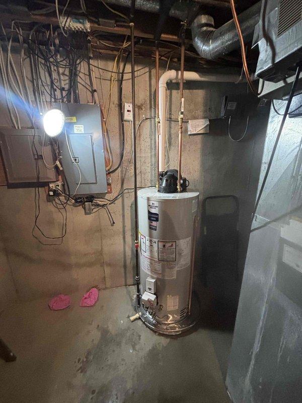 Successfully completed water heater installation in basement utility area. New unit was properly connected to existing copper plumbing and electrical systems. Installation included all necessary connections to ventilation components and manufacturer-recommended setup procedures.
